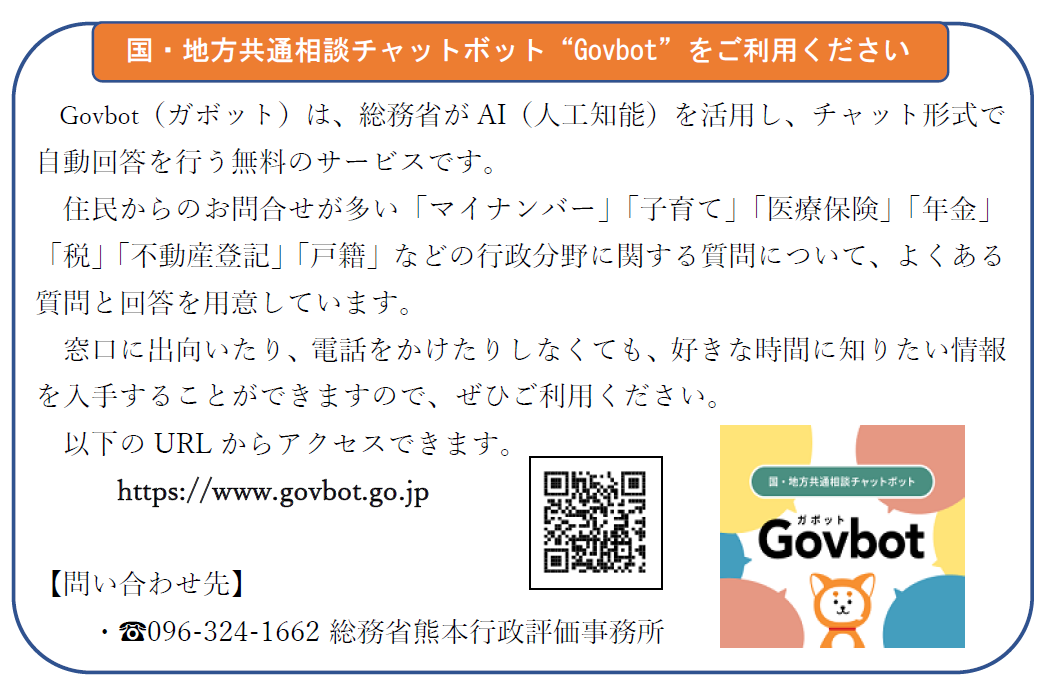 総務省では、「マイナンバー」「子育て」「税」など、住民の関心が高い行政分野の質問にAI(人工知能)が自動で回答するチャットボット「Govbot(ガボット)」を運用しています。窓口が閉まっている時でも24時間いつでも利用でき、必要な情報を得ることができます。