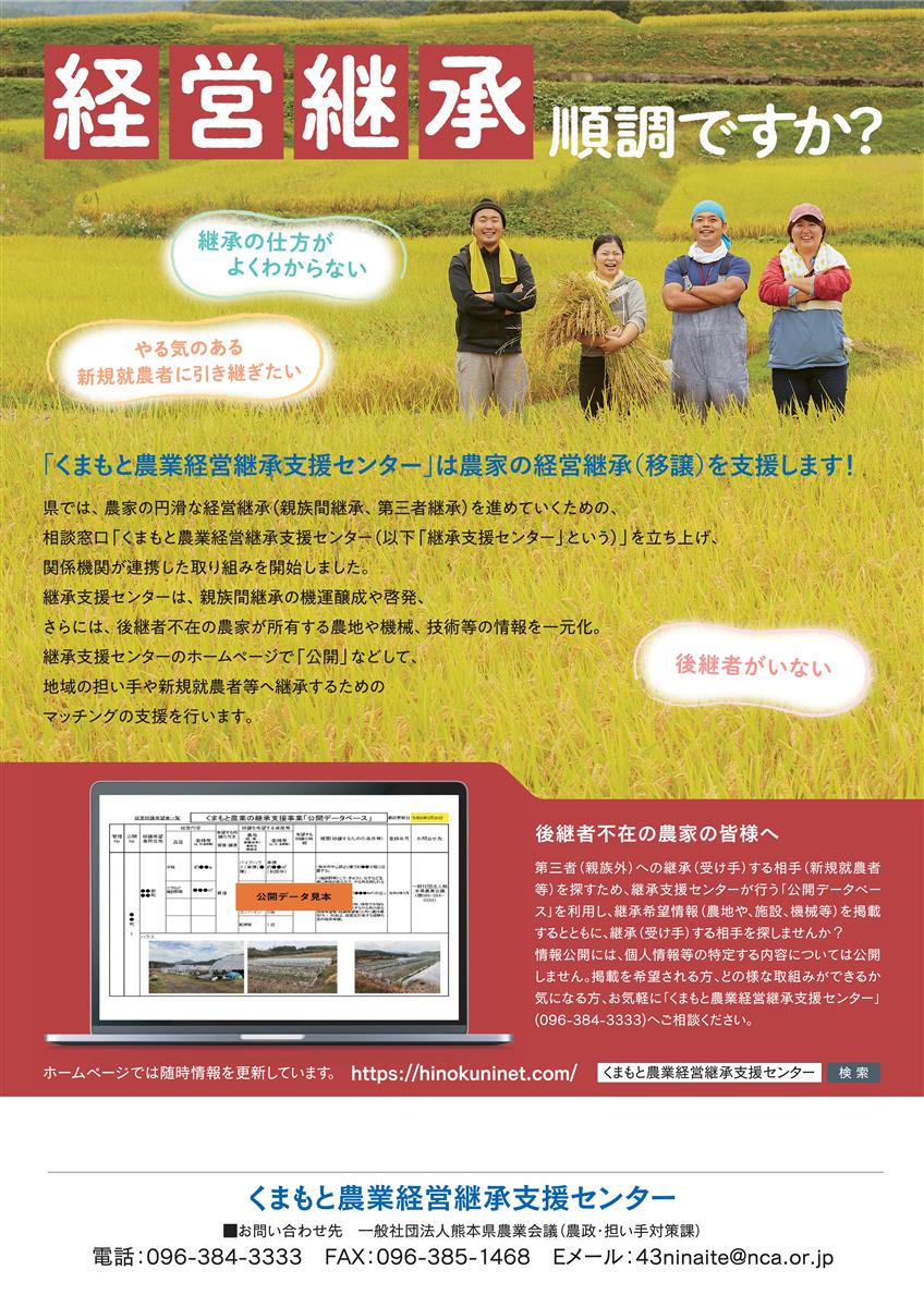 熊本県では、農業を継続して発展させていくため「くまもと農業経営継承支援センター」を設立して、農業経営の継承を支援しています。